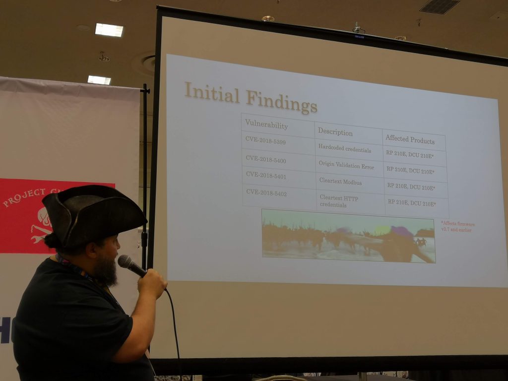 Ensuite vient la présentation du lab mis en place, avec un accès réseau direct aux ICS, ainsi qu’un accès sans-fil pour utiliser l’application android de la société (oui, vous avez bien lu). Et enfin, présentation de la méthodologie de bug bounty. Du très classique, appuyé de bonnes compétences. Des scans réseau, de l’analyse de code, du brute force, etc… Du basique, et c’est le hacker lui-même qui le précise et le rappelle : rien de drastique ! Résultat, 4 CVE (Common Vulnerabilities and Exposures) découvertes, dont une à propos d’identifiants codés en dur sur le système ! Les détails techniques sont ensuite donnés et expliqués sur ces découvertes.