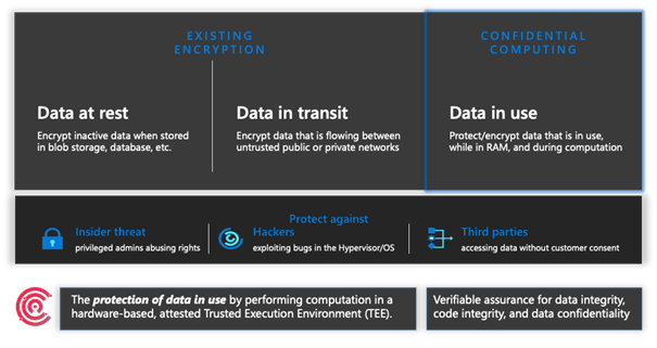 « Protection des données en cours d'utilisation en effectuant un calcul dans un environnement d'exécution approuvé (TEE) basé sur le matériel attesté. » (TEE=Trusted Exécution Environment)