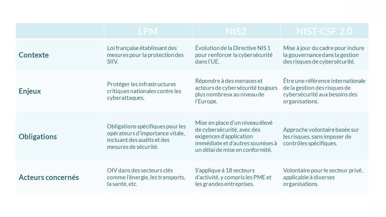 Bien qu’il ne soit pas question ici de dresser un inventaire exhaustif, il est essentiel de se pencher sur trois de ces dits cadres réglementaires emblématiques : la Loi de Programmation Militaire (LPM) en France, la directive sur la Sécurité des Réseaux et de l’Information (NIS-2) de l’Union Européenne, et les normes de sécurité informatique établies par le National Institute of Standards and Technology (NIST-CSF 2.0) aux États-Unis. L’analyse de ces dispositifs législatifs permettra de saisir pleinement leurs implications, leurs particularités, leurs points communs et la manière dont ils s’entremêlent, afin de comprendre comment ils façonnent le paysage de la cybersécurité mondiale.